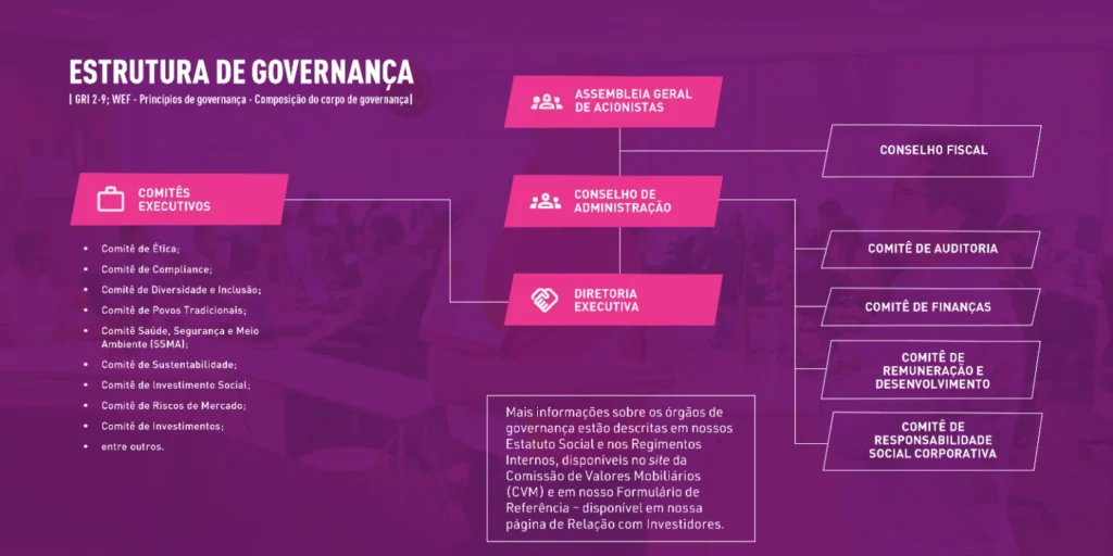 • COMITÊS DE ASSESSORAMENTO: são essenciais para enriquecer as deliberações do Conselho de Administração, promovendo discussões de temas específicos, incluindo um fórum dedicado à sustentabilidade.
