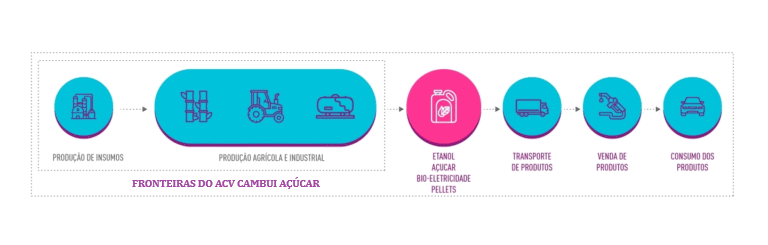 A Cambui Açúcar realiza anualmente ACV de seus principais produtos (açúcar, etanol 1G e 2G, cogeração,pellets e biogás). Para garantir uma adequada mensuração e gestão das emissões de GEE que ocorrem durante o processo produtivo, os estudos de ACV que realizamos de forma independente utilizam uma abordagem do “berço-ao-portão”, que contabiliza todas as emissões envolvidas no processo produtivo até o “portão” das nossas usinas, conforme o fluxograma: