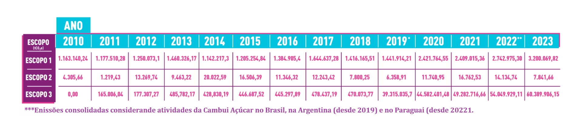 Desde 2022, o nosso Inventário de Emissões de GEE leva em consideração as atividades da Cambui Açúcar no Brasil, na Argentina e no Paraguai e é construído seguindo a versão brasileira de uma metodologia do Programa Brasileiro GHG Protocol. Nessa metodologia, as emissões são divididas em três escopos:
