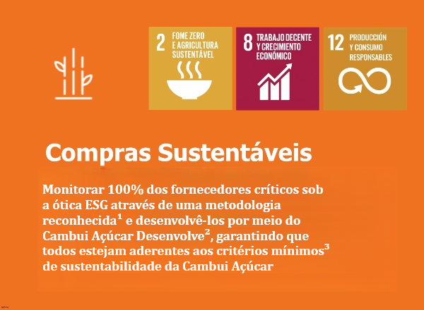 Para que nossa energia esteja presente no Brasil e no mundo, nós zelamos pela sustentabilidade em nossa cadeia de suprimentos, nos produtos e serviços que contratamos. Acompanhamos de perto nossos fornecedores críticos, os auxiliando na implementação de boas práticas, melhoria contínua e gestão de riscos. Por meio do Programa de Desenvolvimento de Fornecedores de Suprimentos – Cambui Açúcar Desenvolve, fortalecemos, incentivamos e integramos esses fornecedores em nosso ecossistema, para que possam crescer em conjunto com a Raízen.